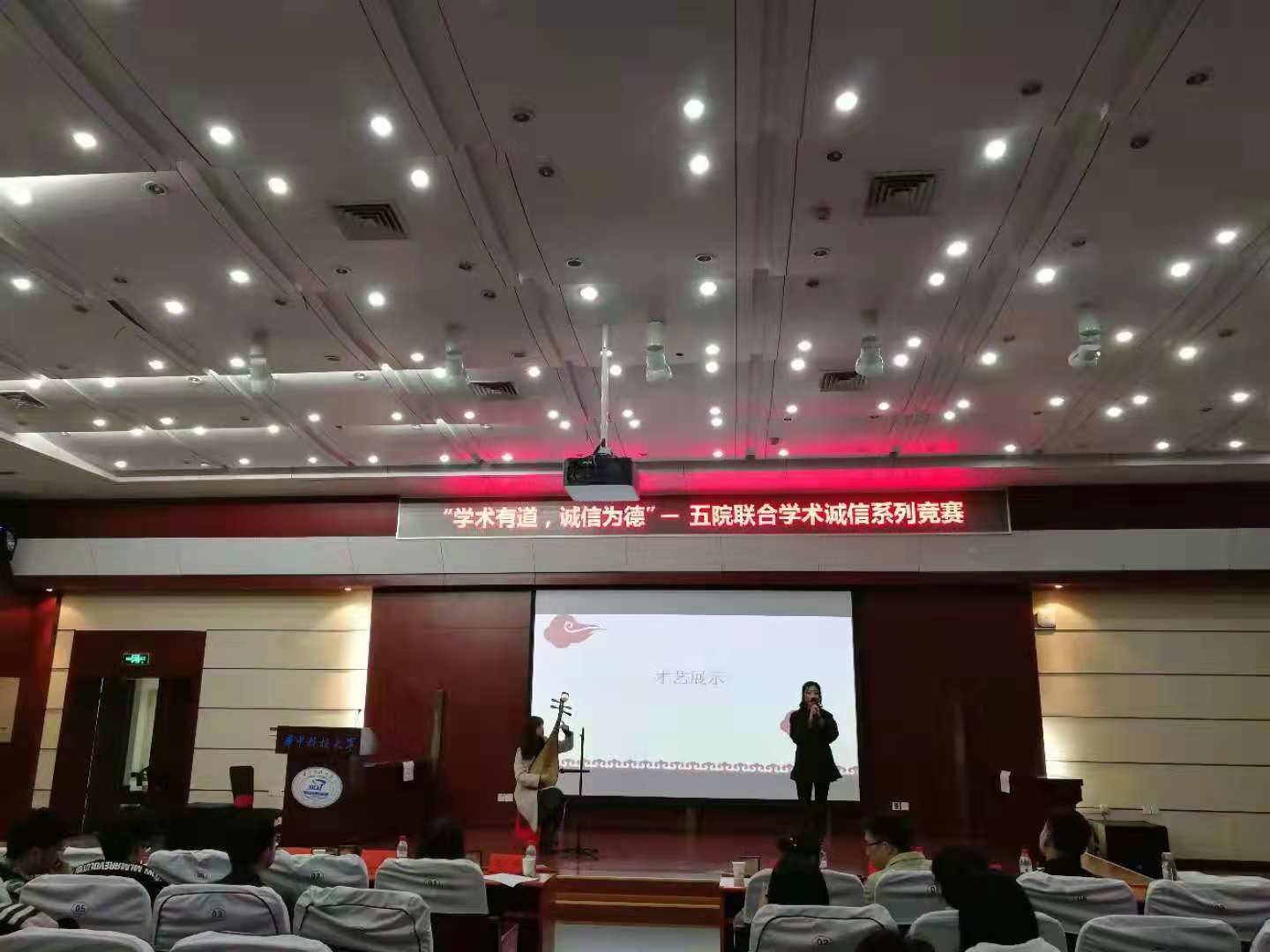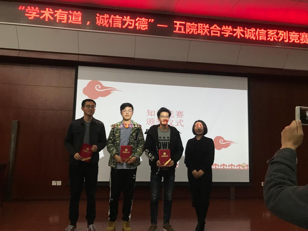 在知识竞赛部分,竞赛分为 “百花齐放”、“眼疾手快”、“你画我猜”三个环节,穿插中场观众互动环节,内容涉及学术诚信内涵、学术规范等多项内容,现场气氛高涨,选手答题争先恐后,竞争激烈,观众互动十分踊跃,同学们的妙语连珠也让紧张的现场气氛变得活跃起来。由五个学院随机分配组成的三支队伍经过累计积分,最终由公司徐佳辉硕士、法学院伯杨硕士以及教科院黄安硕士组成的第三代表队夺得知识竞赛一等奖。