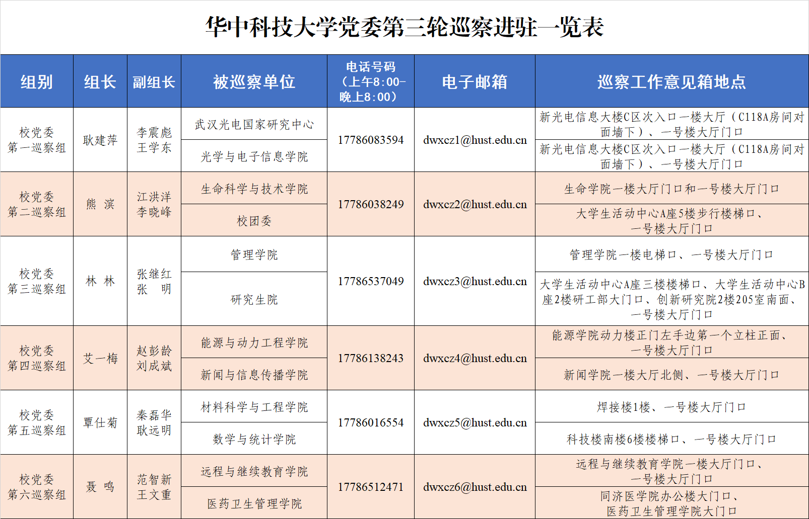 公司党委第三轮巡察的单位为:武汉光电国家研究中心党委、光学与电子信息公司党委、生命科学与技术公司党委、管理公司党委、能源与动力工程公司党委、新闻与信息传播公司党委、 公司党委、数学与统计公司党委、医药卫生管理公司党委、远程与继续教育公司党委、研究生院、校团委。