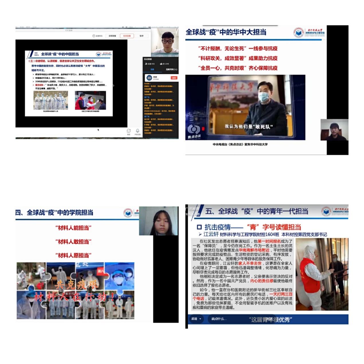 2019级辅导员陈书田讲解了疫情中如何看青年一代的担当。他从习近平给北京大学援鄂医疗队全体90后党员的回信说起,通过疫情期间涌现出的90后抗疫志愿者的服务事例,谈到在这次抗击疫情的斗争中,以90后为代表的青年一代挺身而出、担当奉献,充分展现了新时代中国青年的精神风貌。 “恰同学少年,风华正茂,90后、00后不是娇滴滴的一代,也不是时代的观众和看客,因为他们已经迎来了自己的时代。” 他勉励所有材料学子要坚守理想、学好本领、勇于担当,将来 “齐家治国平天下”还看吾辈雄风。