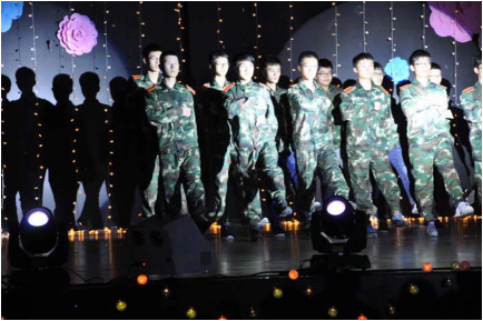 晚会伴随着钢琴独奏声开始。晚会第一个节目就引起威廉希尔足球新生深深的共鸣,一排排小绿人整齐地踢正步,向右转,正是新生们军训的缩影。不禁让人回想起从开学时的相遇,军训时的相知,再到现在相守于威廉希尔足球,就像本次文化节相遇相识相知三个主题一样。