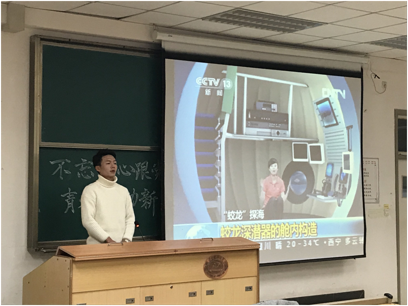 报告会之初,李超然同学带领与会同学们参观了“砥砺奋进的五年”大型成就展网上展馆,系统地介绍了五年来国家在共产党的领导下取得的一系列重大科技成就:蛟龙号,复兴号……紧接着,他又用实际数据向同学们介绍了国民经济在过去五年内取得的巨大的增长。报告会临近尾声,李超然同学以纪录片《强军》阐明了国家国防力量的日益强大,大国盛况让与会同学激动不已,热血沸腾。