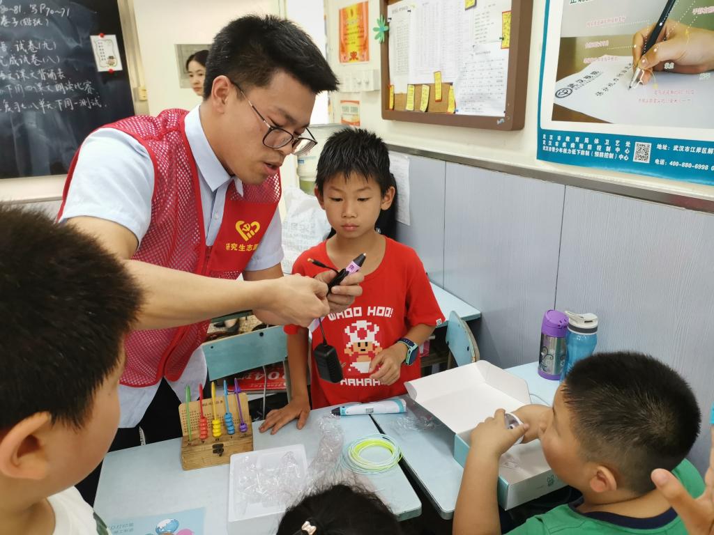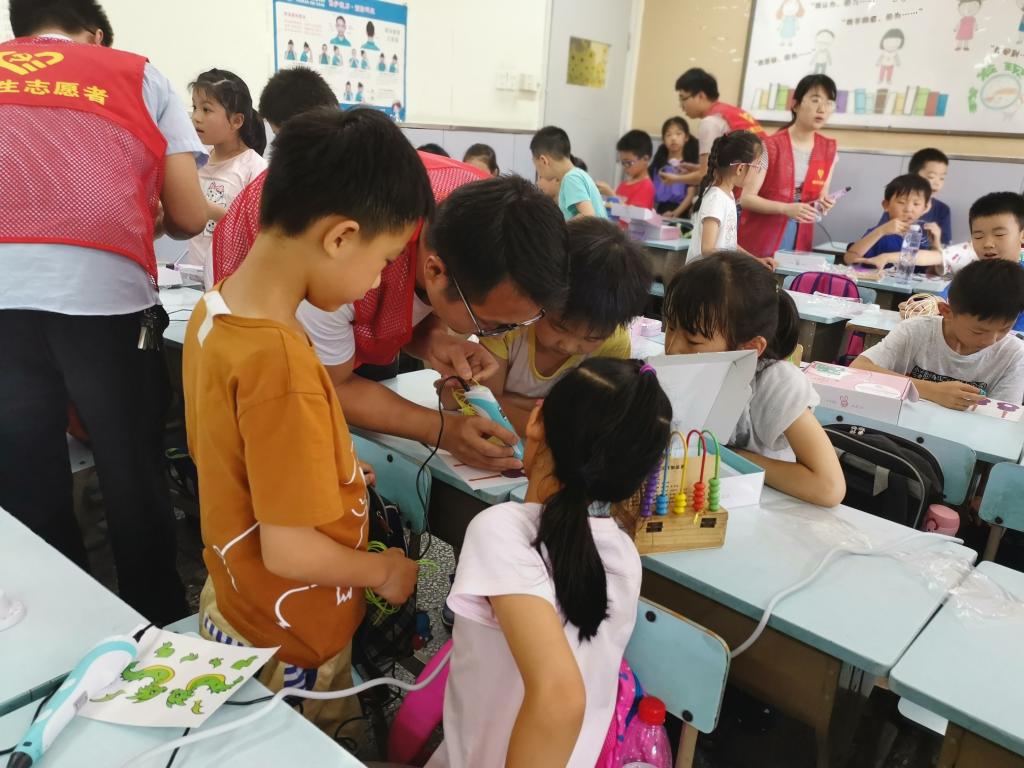 紧接着便是激动人心的“3D打印笔立体绘画操作”环节——每位同学通过3D打印笔,亲自动手制作3D立体绘画作品。当同学们拿到材料包后,便迫不及待地开始了操作,研究生志愿者们分组指导、帮助同学们按照说明书一步步地进行。同学们热情高涨,不畏困难,按部就班地制作自己喜爱的作品,遇到问题或困难,或互帮互助,或举手求助,一时间,“老师!老师!”的求助声从四面八方响起。志愿者们兢兢业业,担任起小老师的角色,刚刚帮完这位同学接好3D打印笔,接着又帮那位同学完善作品,一会还要指导下一位同学连接线路。尽管同学们遇到了各式各样的问题,但在志愿者们的帮助下,一切都在有条不紊地进行着,3D立体绘画作品在各位同学手中逐渐有了雏形。