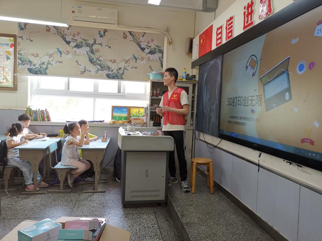 下午15时,研究生3D小分队6位研究生在学院研究生工作组王曦老师的带领下,开始题为“3D打印创无限”科普教学活动,活动主要分为“3D打印科普微课堂”和“3D打印笔立体绘画操作”两个环节。在3D打印科普微课堂环节,研究生志愿者阚隆鑫首先向同学们抛出“3D打印可以打印一切吗?”等问题,引发了大家的思考。紧接着,阚隆鑫结合动画视频,通俗易懂地向同学们展示了3D打印技术的原理,以及相对于传统的切削等减材制造技术,3D打印在适应复杂结构的快速制造、在快速制造灵活性和节约耗材、绿色环保等方面所具有的独特优势;同时,阚隆鑫向同学们列举了现实生活中应用3D打印技术的丰富事例。课堂上同学们认真听讲,积极发言,在欢声笑语中逐渐建立起对3D打印技术的初步认识。