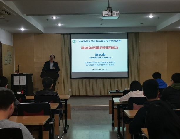 (通讯员:王曦)为不断提升研究生科研能力和加强研究生诚信教育,应威廉希尔足球副经理杨君友邀请,武汉理工大学材料复合新技术国家重点实验室赵文俞教授于2019年11月14日晚,在先进制造大楼西楼A308给学院研究生做了一场“漫谈如何提升科研能力”——“学术船行千里,诚信迎风为帆”导师与你面对面主题讲座。本次讲座由学院研究生工作组主办,杨君友经理主持。